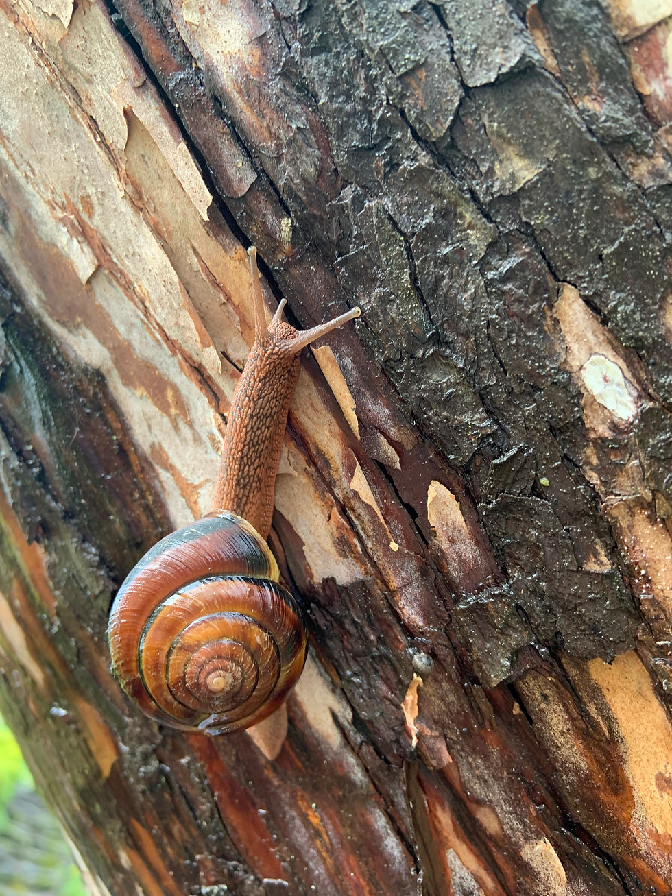 Having spent a lot of time watching snails, they seem to be natural teachers of this--trying, noticing, pausing in the moment. Their little bodies stretch slowly out from the shell. Their 'antennae' reach to the sides and the back, feeling their way on the limb or on the rock. They stop. And then they start again, maybe in another direction. Snails are exceptionally slow, yet I think they are much like other animals who might be moving at faster paces. In general, animals are in their bodies, not in their heads (less brain matter than us, lucky buggers). They use their bodies to feel, explore, and determine if something is what or where they want to be.